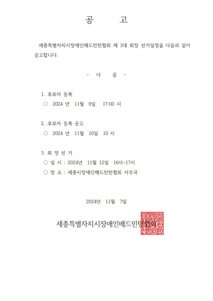 세종특별자치시장애인배드민턴협회 제3대 회장 선거일정 공고